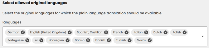 The list of languages available for Plain Language is being expanded continuously. The most up-to-date list can always be found in the configurator in the dashboard.