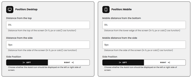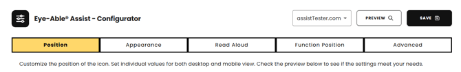 Through the Assist configuration in the Eye-Able Dashboard, you can adjust the icon’s position for both desktop and mobile views. You can define individual values for the top spacing, side spacing, and horizontal alignment (left or right). Use the preview option to ensure that the settings meet your requirements.