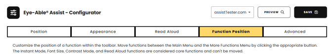 You can also change the position of the functions within the toolbar. Move functions between the main menu and the More Functions menu by clicking the corresponding button. Please note that the functions Instant View, Font Size, Contrast Mode, and Read Website are core functions and cannot be moved.