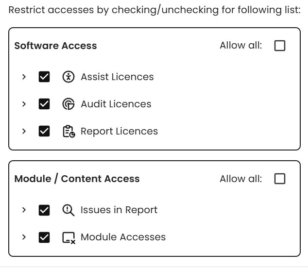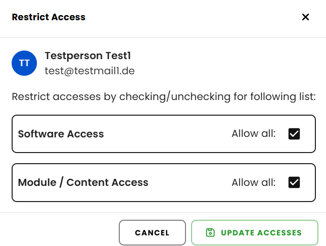 If you remove the checkmark from the overarching terms "Software Access" or "Module / Content Access", a detailed view will open. There, the access can be adjusted individually for domains and modules.