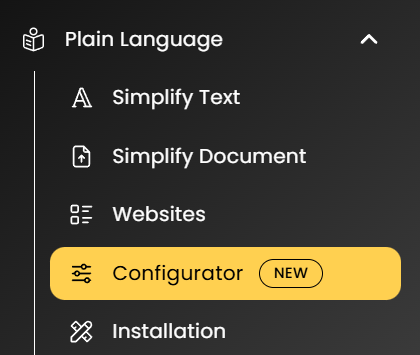 Navigate to the Plain Language menu and select the "Configurator" sub-menu.