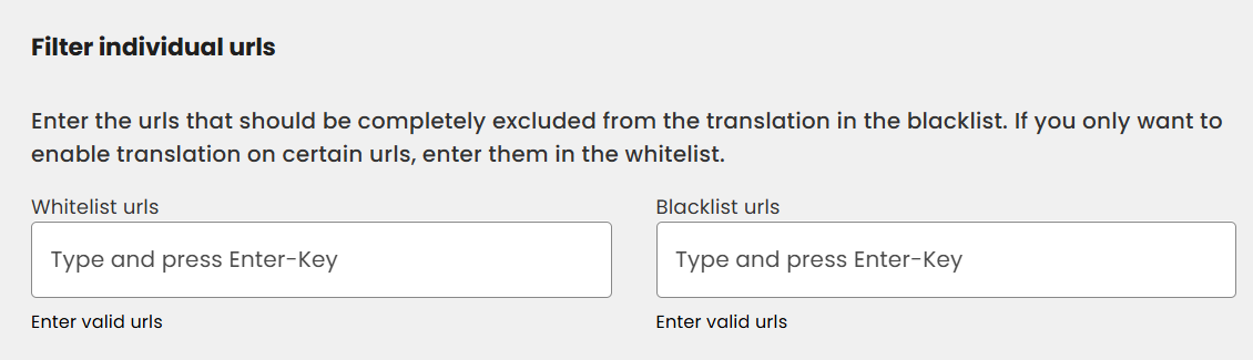 Here, in the "Filter individual URLs" field, you can specifically add URLs to the Whitelist or Blacklist. Enter the URLs in the Blacklist that should be completely excluded from translation. If you want translation to be available only on certain URLs, add them to the Whitelist.