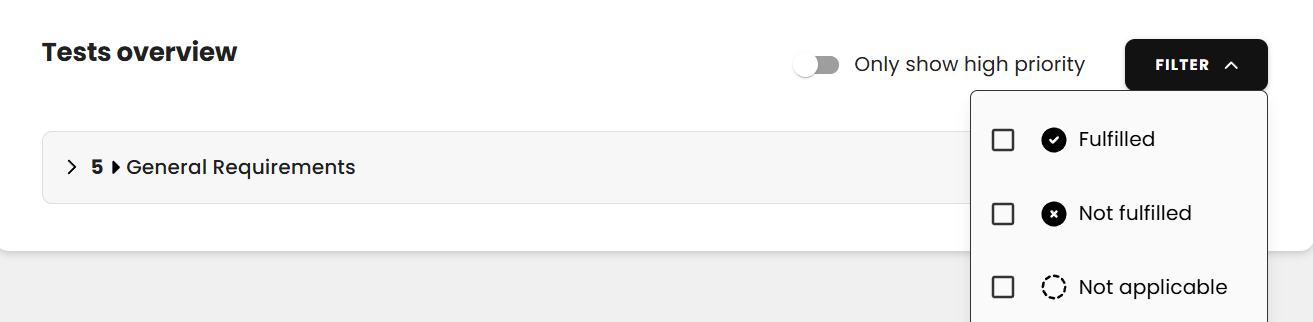 You also have the option of filtering your test results by ‘high priority only’ and ´fulfilled´, ´not fulfilled´ and ´not applicable´.