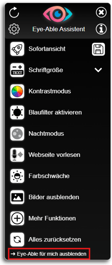 Wenn du dich auf einer Webseite befindest, die Assist integriert hat, kannst du in der geöffneten Toolbar ganz unten auf „Eye-Able für mich ausblenden” klicken.