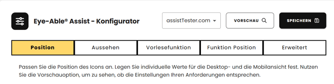 Über die Assist-Konfiguration im Eye-Able Dashboard können Sie die Position des Icons sowohl für die Desktop- als auch für die Mobilansicht anpassen. Dabei können Sie individuelle Werte für den oberen Abstand, den Seitenabstand und die horizontale Ausrichtung (links oder rechts) festlegen. Nutzen Sie die Vorschauoption, um sicherzustellen, dass die Einstellungen Ihren Anforderungen entsprechen.