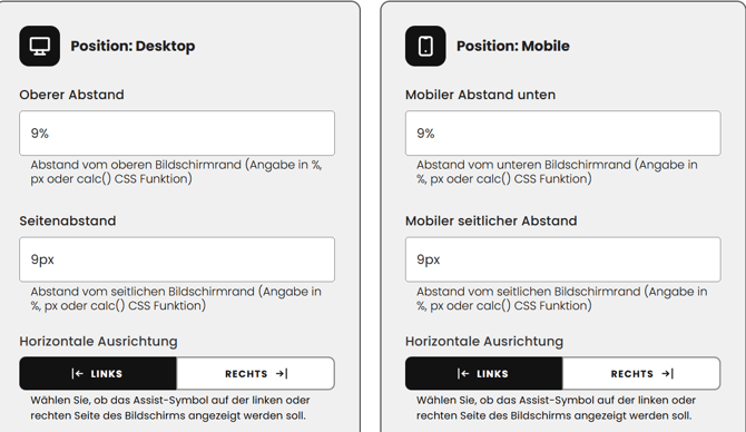 Die Position im Desktop- und Mobilansicht anpassen, den oberen Abstand und den Seitenabstand bestimmen sowie die horizontale Ausrichtung auf rechts oder links festlegen.