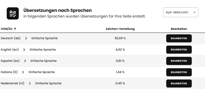 Wenn Sie eine einzelne Text Vereinfachungen bearbeiten möchten, klicken Sie auf das Stiftsymbol, das sich rechts in der Spalte „Aktionen“ befindet. Dies öffnet ein Bearbeitungsfeld, in dem Sie Änderungen vornehmen können.