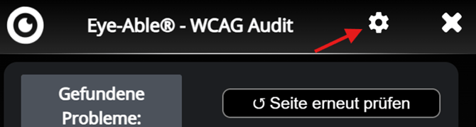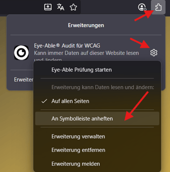 Durch Klicken auf das Zahnrad gefolgt von der Auswahl des Menüpunkts „An Symbolleiste anheften“ kann Eye-Able Audit auch für leichteren Zugriff an die Toolbar gepinnt werden.