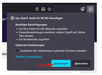 Nachdem die Eye-Able Audit Erweiterung installiert wurde, kann diese über einen Klick auf das Erweiterungen-Icon in der Browser-Toolbar geöffnet werden.