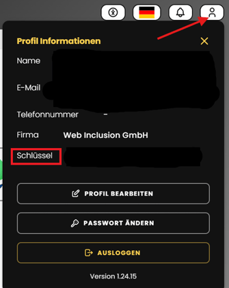 Den API-Schlüssel findet man oben rechts im Eye-Able Dashboard via Klick auf das Profil-Icon.