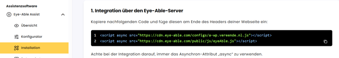 Den Installationscode findest du in deinem Eye-Able Dashboard in dem Untermenü "Installation" des gewünschten Produkts. Zum Beispiel für Assist: