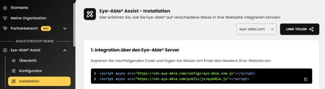 Den Installationscode für die gewünschte Eye‑Able Lösung aus deinem Dashboard kopiert hast. Dieser Code ist speziell für deine Domain konfiguriert.