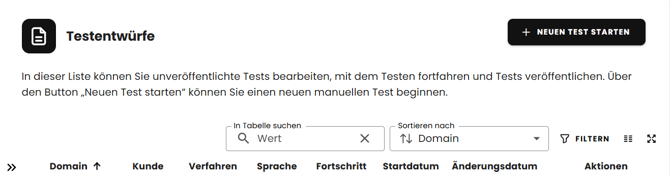 Ihren Testentwurf finden Sie nach dem Start automatisch im Reiter „Testentwürfe“ in der Übersichtsliste.