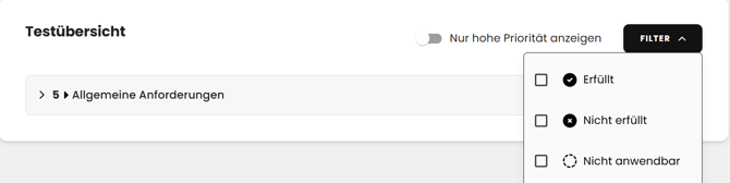 Außerdem haben Sie hier auch die Möglichkeit ihren Bericht nach "nur hohe priorität" und "Erfüllt", "nicht erfüllt" und "nicht anwendbar" zu filtern.
